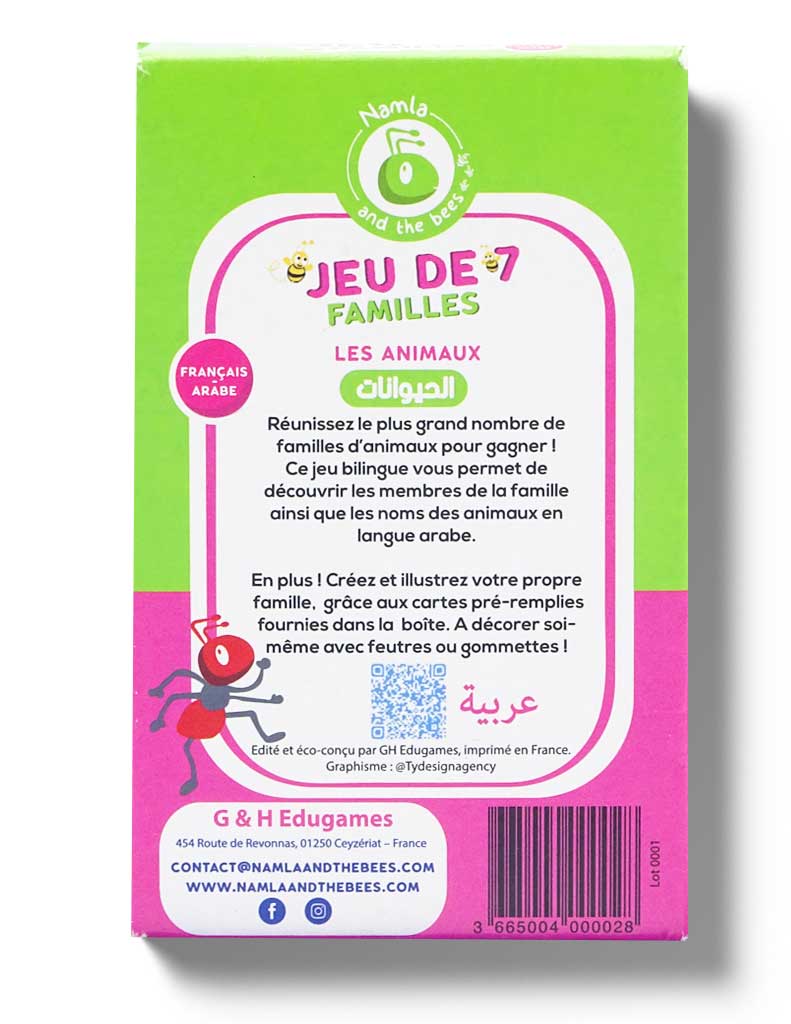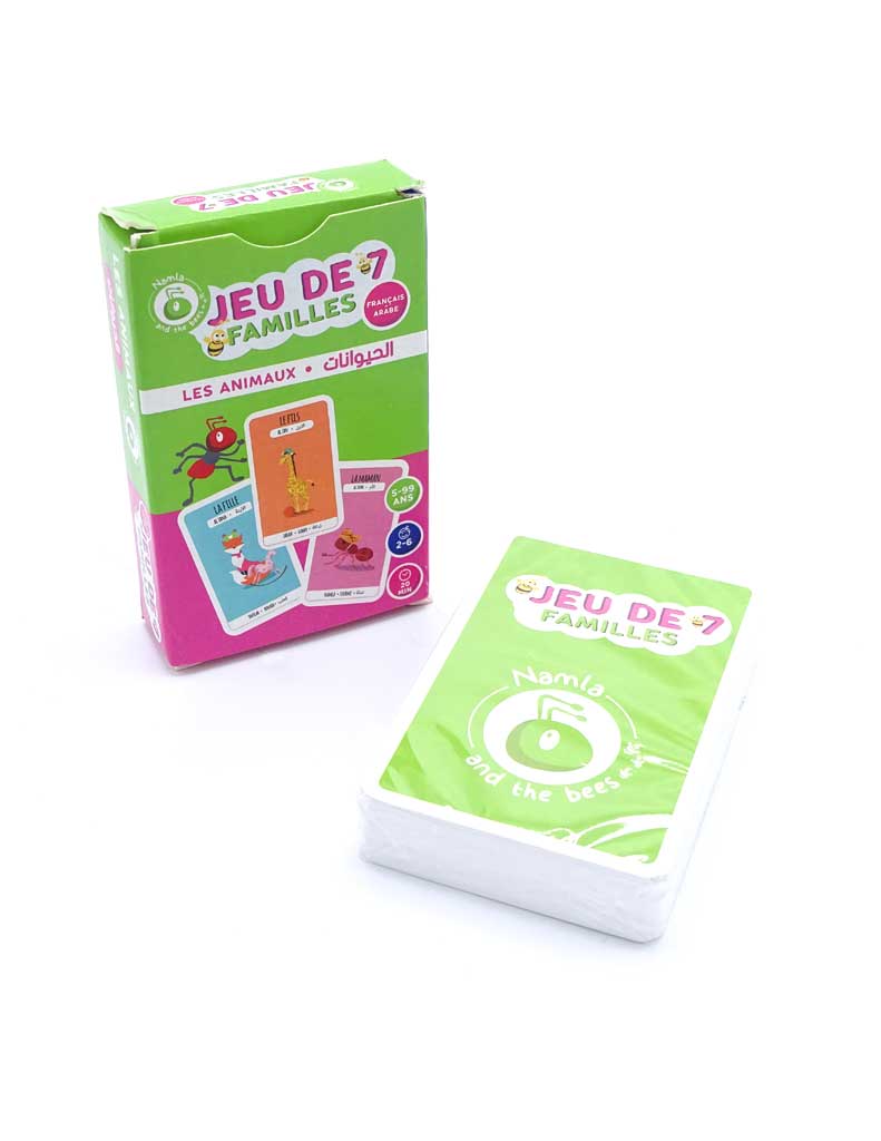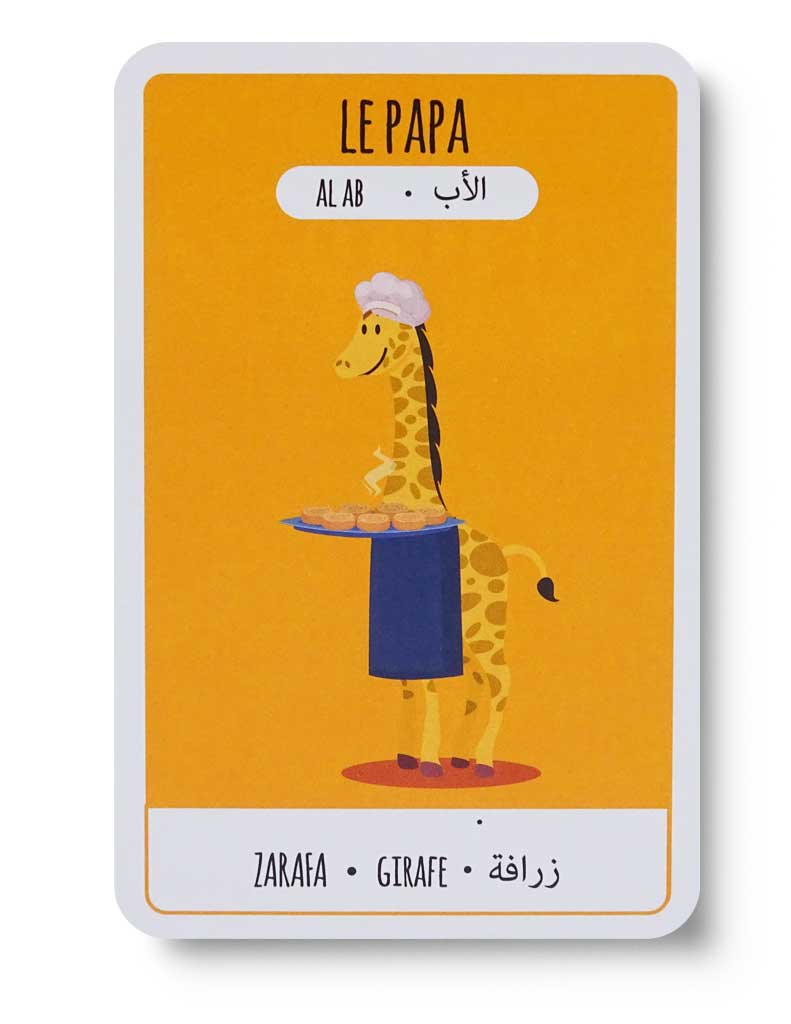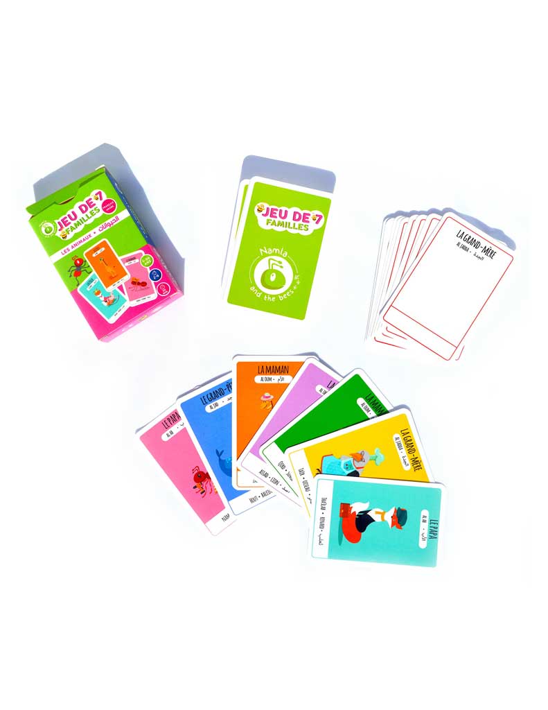 Toutes les cartes sont bilingues, ainsi tu peux jouer en français, en arabe, ou en mélangeant les deux langues, le plus important c’est de s’amuser!!! et peut-être que tu apprendras les noms des animaux ou les membres de la famille à la fin de la partie !